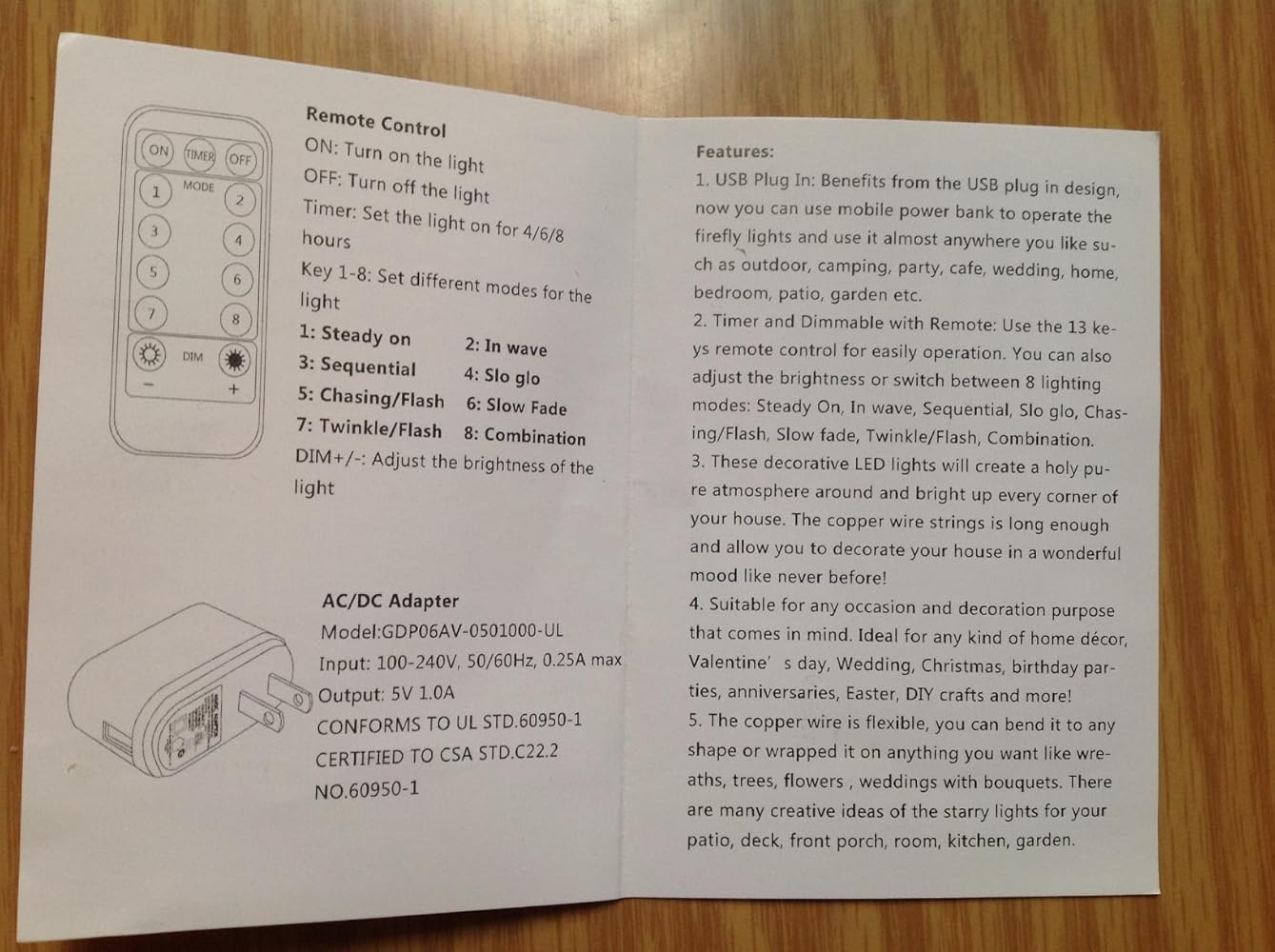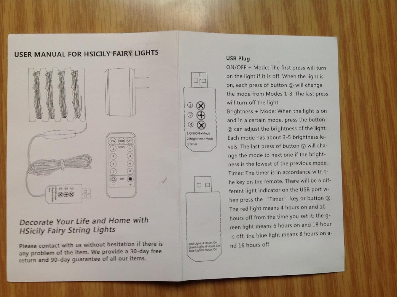 I ordered one string of lights and another string of color lights from a different supplier to compare them. The flashing patterns offered by these lights simply outshone the competition. For me to choose them over color-changing lights was surprising to me.I bought a second string of twinklexmas lights and began working on a project with them. Carefully bending/shaping the strings into place, my daughter and I redecorated two wire deer. After all the handling, the lights still worked. On the downside, one set stopped after a few minutes. My husband figured that the AC adapter was faulty and used a spare from his cell phone. All good - and both strings worked for many hours every day through the holidays - at least a month.I contacted Hopeshop to request a functioning AC adapter. After a couple of polite emails discussing the problem, Hopeshop sent apologies and a new string of lights!As for the package, Hopeshop sends:1. the lights in bubble wrap;2. the AC adapter with a plastic cover;3. the controller unit in a plastic bag (battery has a plastic tab to prevent contact),;4. a business card with details how to contact Hopeshop;5. INSTRUCTIONS to use the lights.For clarity, I am attaching photos of the instructions. I found the light controller easy to use - line of sight - without the instructions, but I read them afterwards just to be sure I found all the options.Hsicily/Hopeshop lights are beautiful with blue-white color, good range of brightness, and awesome flashing modes. The delicate wires blend into displays and are not as fragile as they seem. With such excellent customer service, one can buy Hopeshop products with confidence. I recommend these lights highly!