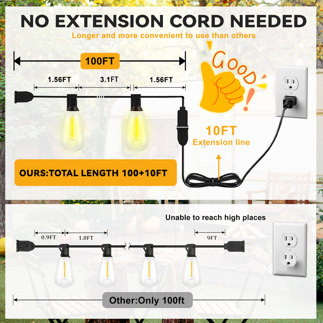 - High Quality: 100FT lights -32 ST38 bulbs included (+2 extras) with 10FT, durable for year-round use.